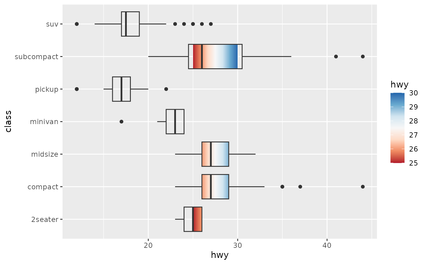 g <- ggplot(mpg, aes(hwy, class, fill = 1))