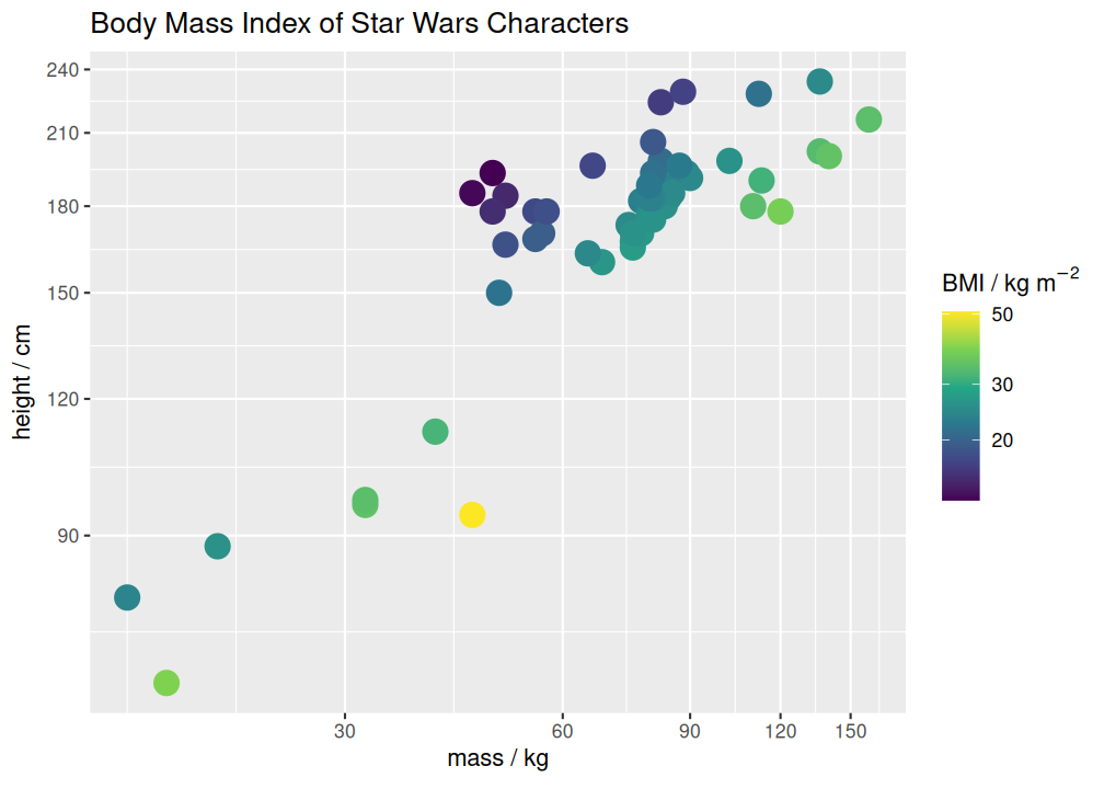labs(color = "BMI", title = "Body Mass Index of Star Wars Characters")